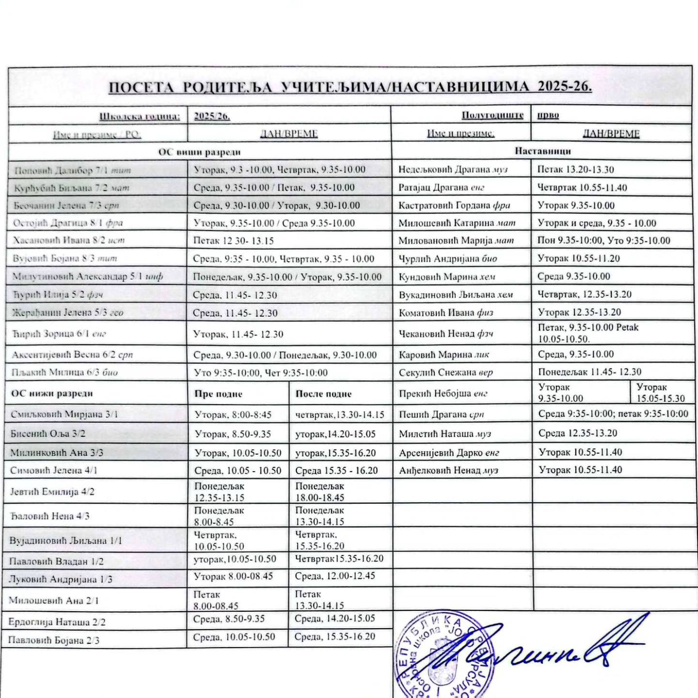 Термини посете родитеља учитељима и наставницима 2025/26.Датум: 26. Septembar 2025 09:16 Категорија: НовостиТермини посете родитеља учитељима и наставницима 2025/26. годПрочитај |
