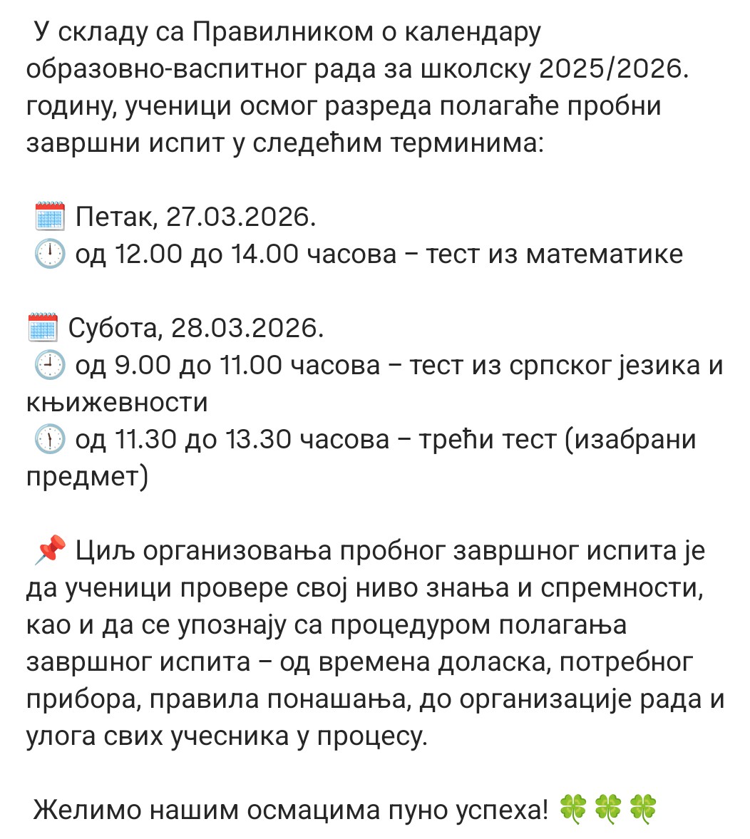 Распоред припремне наставе за завршни испитДатум: 20. Januar 2026 12:48 Категорија: НовостиРаспоред припремне наставе за завршни испитПрочитај |