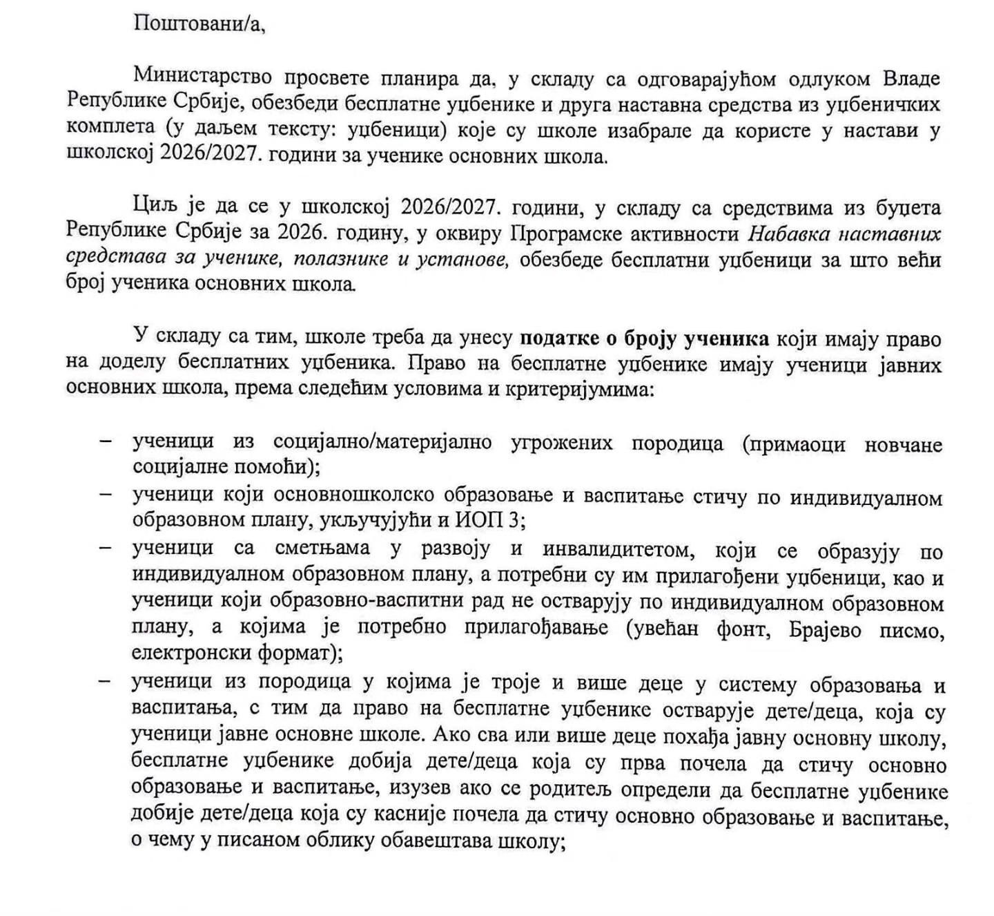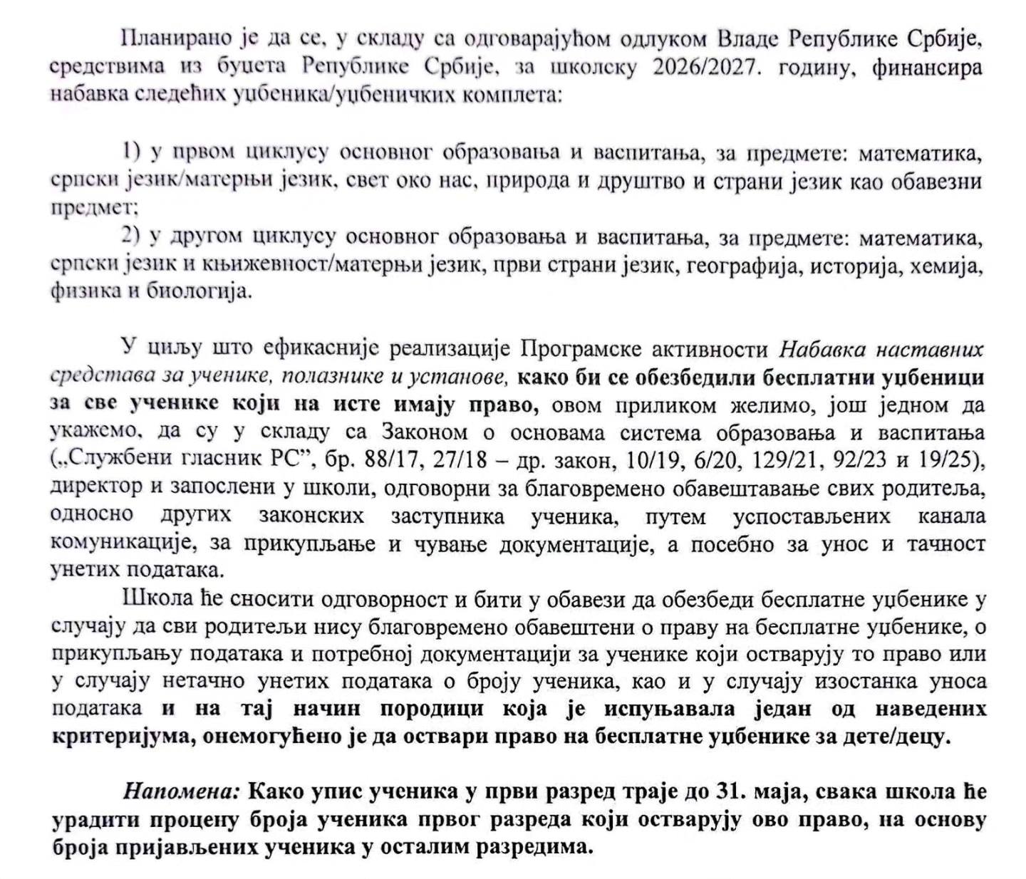 ОбавештењеДатум: 09. Februar 2026 11:29 Категорија: НовостиОбавештење о почетку спровођења избора уџбеника за школску 2026/2027. годинуПрочитај |